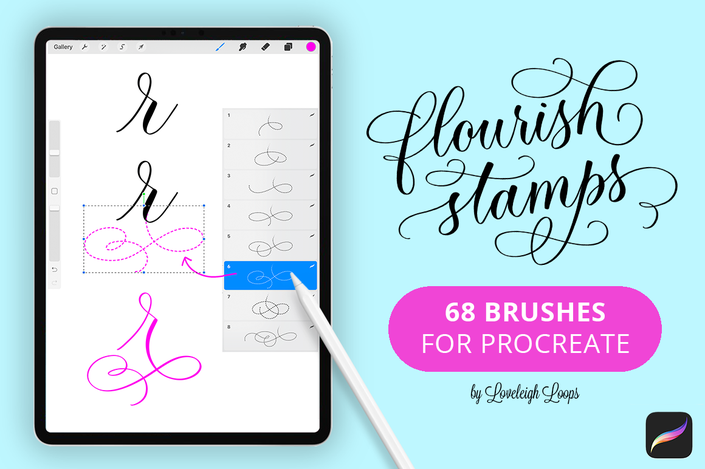 What's included: 63 Flourish Stamp Brushes 5 Lettering Brushes + Guide Sheets 20pg In-Depth User Guide PDF